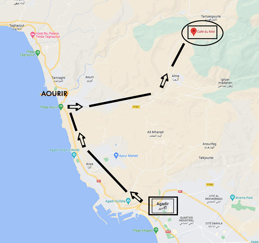 - à Aourir au rond-point, prendre à droite vers Imouzzer